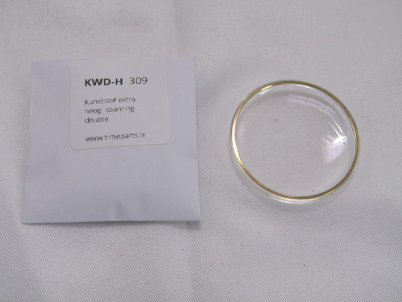KWD-H (ATGH) plastic watch glasses are curved plastic waterproof watch glasses with a double (gold-colored) ring on the inside. The glasses are extra high. These plastic glasses are pressed with a glass press.